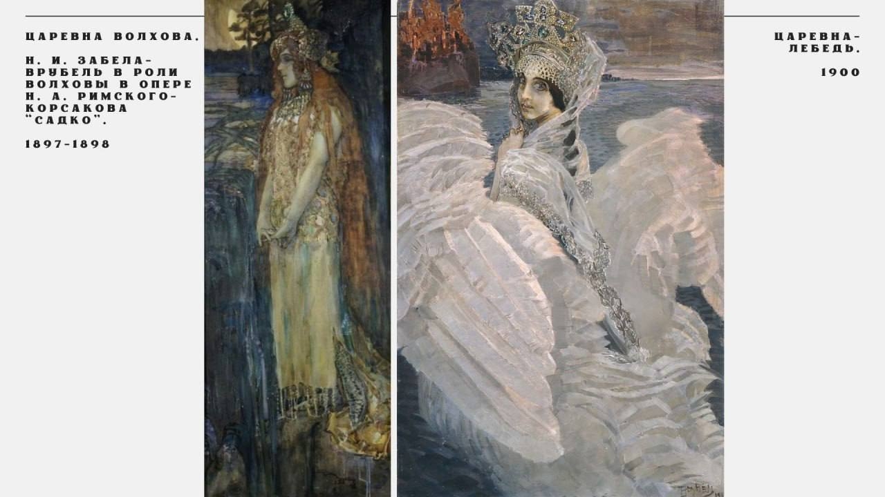 Так, загадочная «Царевна-Лебедь» выросла из сценического образа, который художник придумал для своей жены, оперной певицы Надежды Забелы. В самом фоне этой картины угадываются декорации города Леденца из "Сказки о царе Салтане".