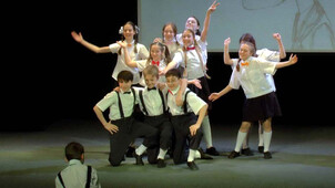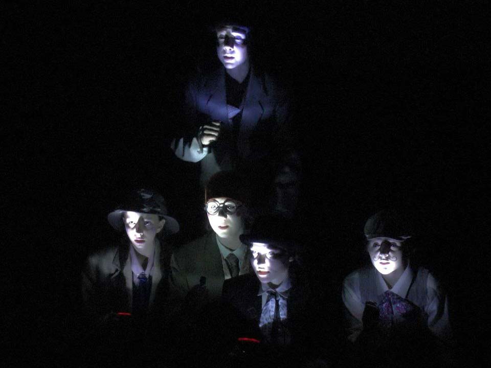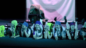 Через несколько минут сцена наводняется множеством персонажей самого красочного вида. Они размахивают листовками, светят в темноту фонариками и запускают в зал огромные воздушные шары.