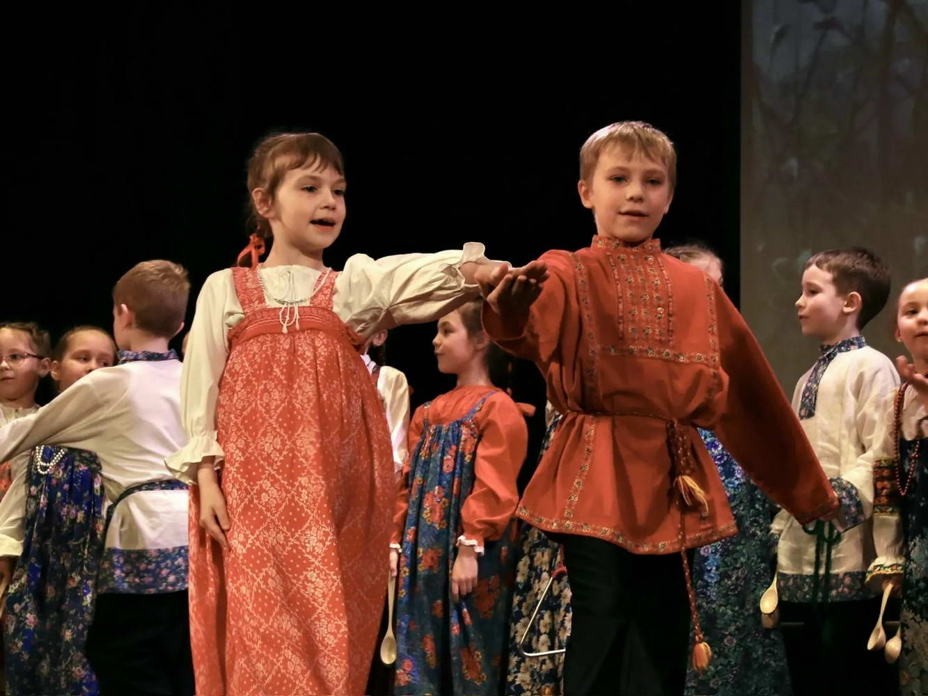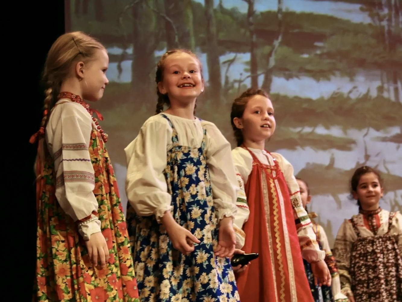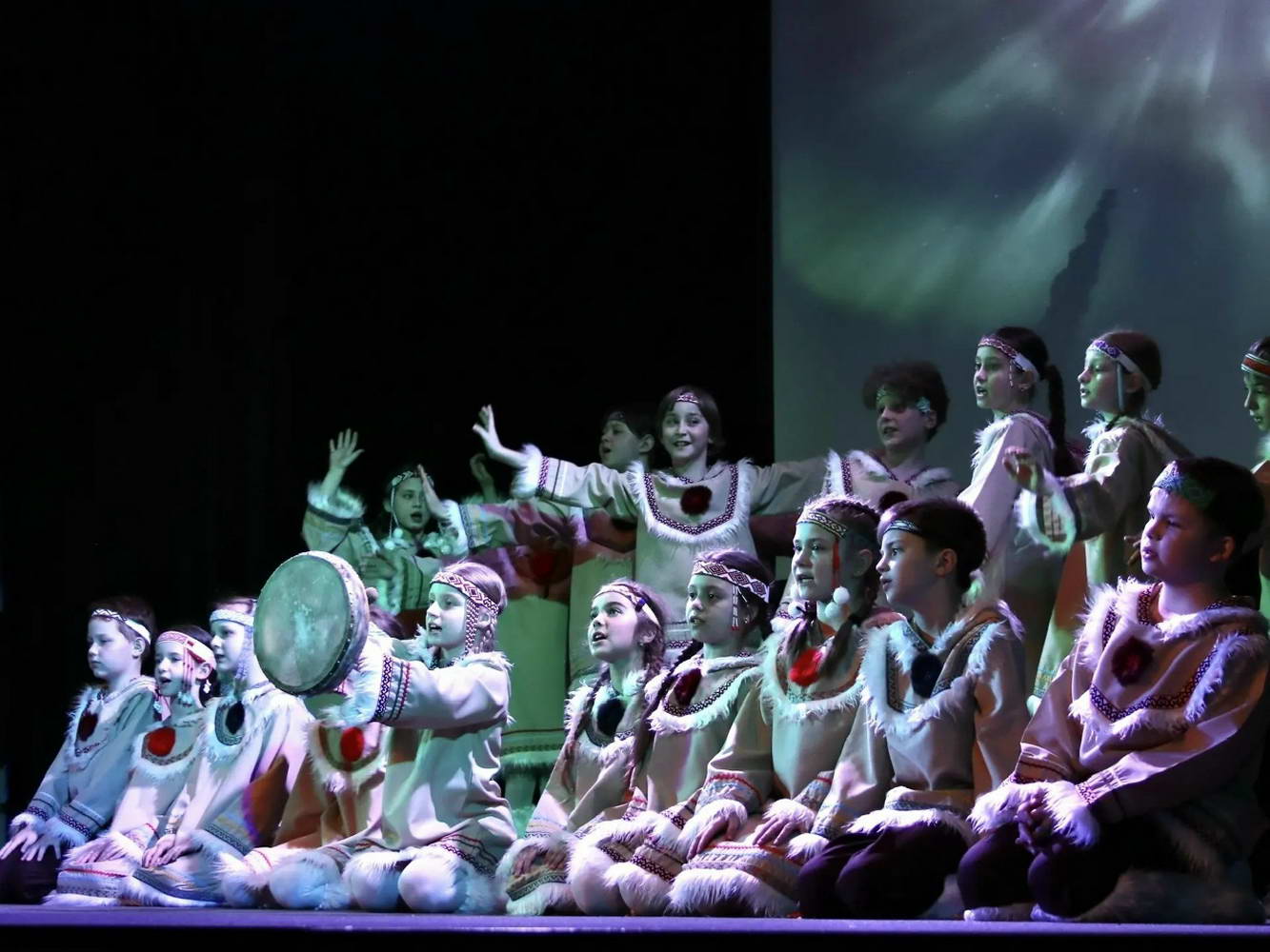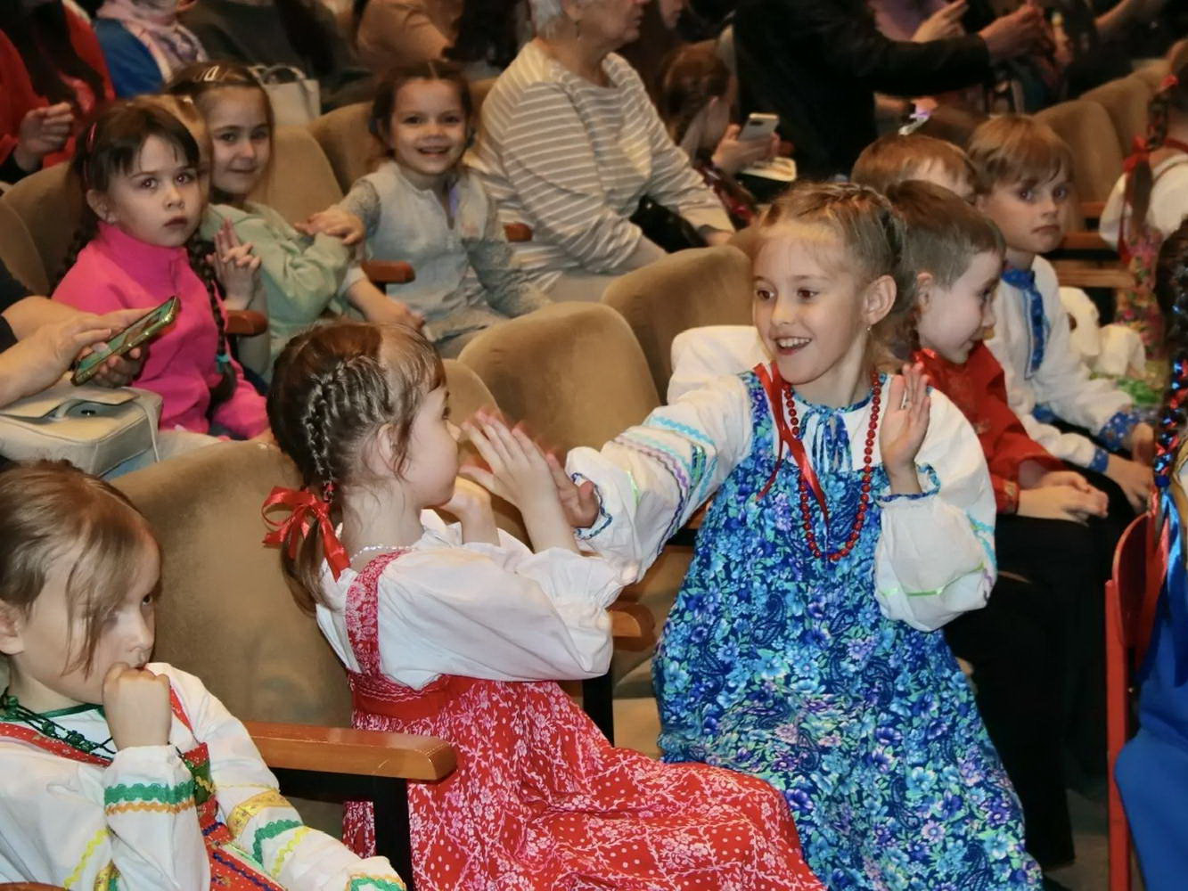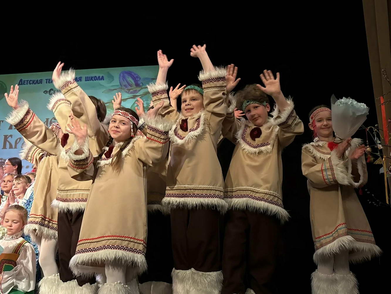 На сцене творилось настоящее волшебство! Наши юные «Театралики» и ученики групп «Антре», «Фантазия» и «Миниатюра» вместе с ребятами из ансамбля «Перезвоны» и нашими педагогами исполняли духовные стихи, весенние заклички и самые разные народные песни. Зал даже заворожило чукотское сказание «Северное сияние»!